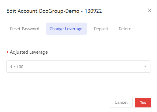 Click the gear-like icon in the upper right corner of the account, select a new leverage and click“OK”.