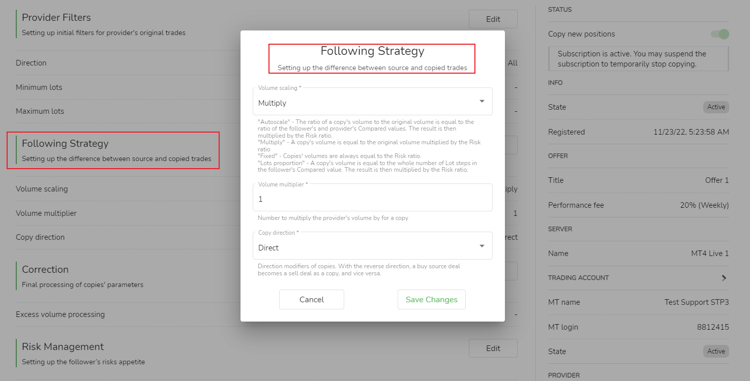 - The correction sets the maximum amount of copied trades that will eventually be executed. CopyTrading's follower can not only control the risk of the trading position of the signal source, but also control the risk of the size of the position they should place.