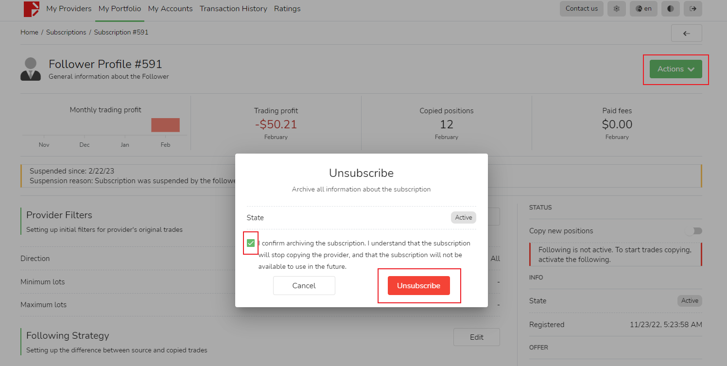 If followers want to stop following, they need to click the red [Unsubscribe] button.