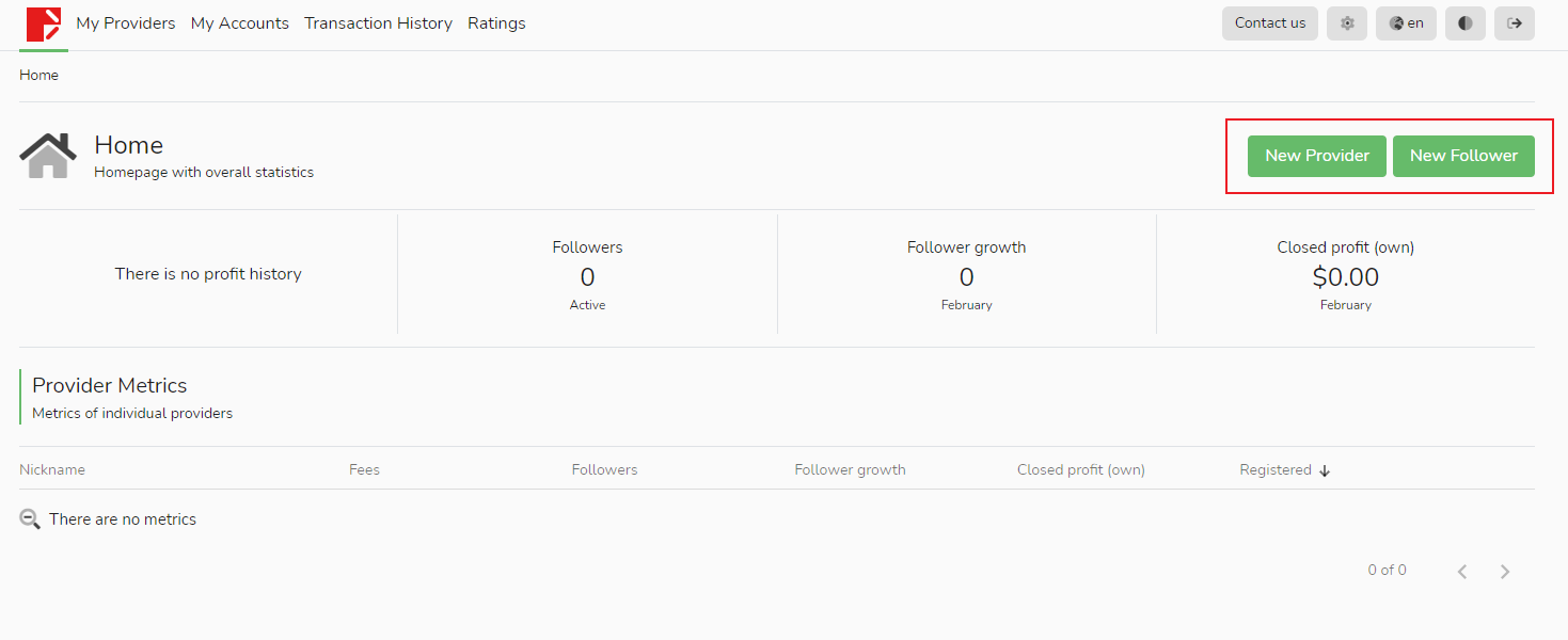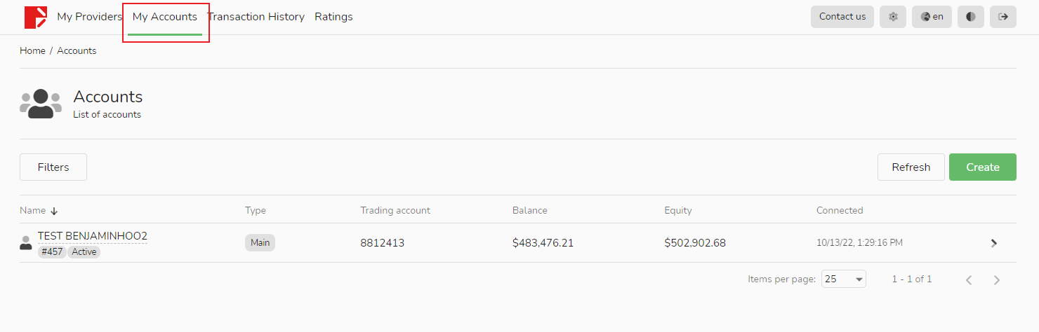 On the follower's [My Account] page, you can add a new trading account by clicking the green [Create] button. However, this account cannot be used to log in, and can only be selected as a signal source, follower or set up to receive performance fees.