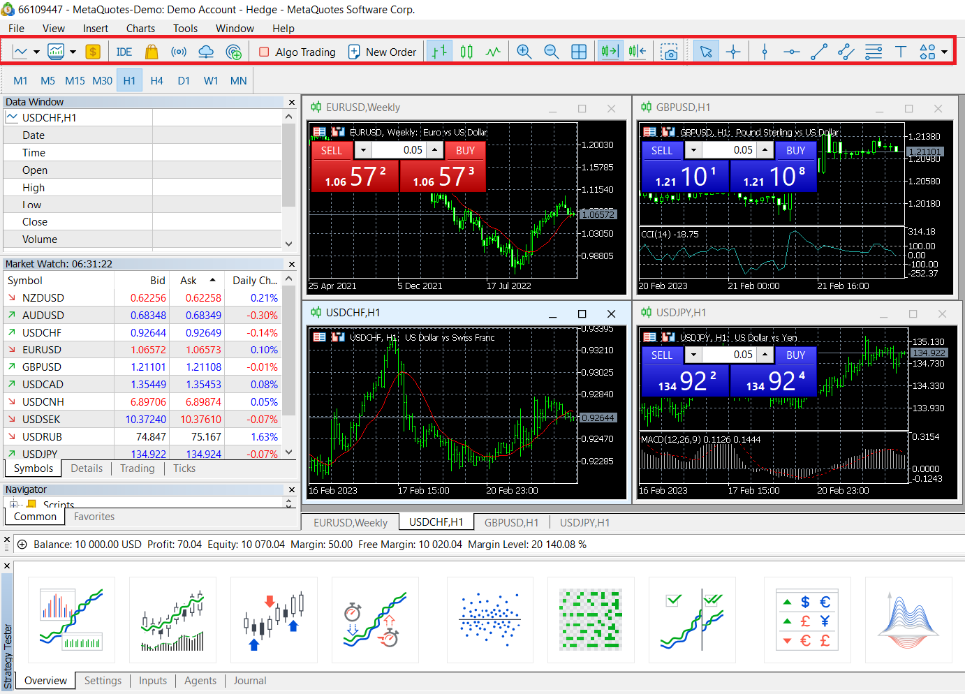 Commonly used or key functions in the main menu are located in the toolbar, which is convenient for users to quickly operate, such as searching for trading symbols, placing orders, adjusting chart types and adding graphical indicators, etc.