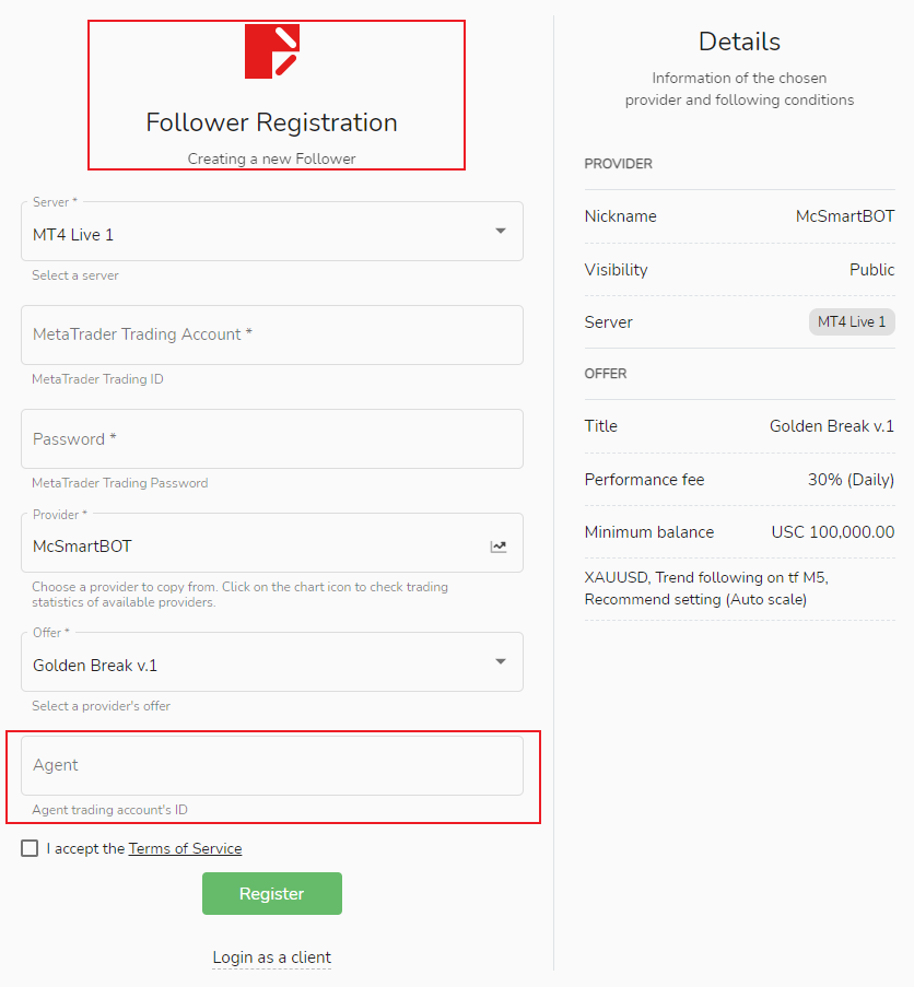 Cuando el usuario se registra como seguidor, solo necesita ingresar la cuenta comercial MetaTrader de la promoción de introducción en la página de registro para agregar el promotor de introducción.