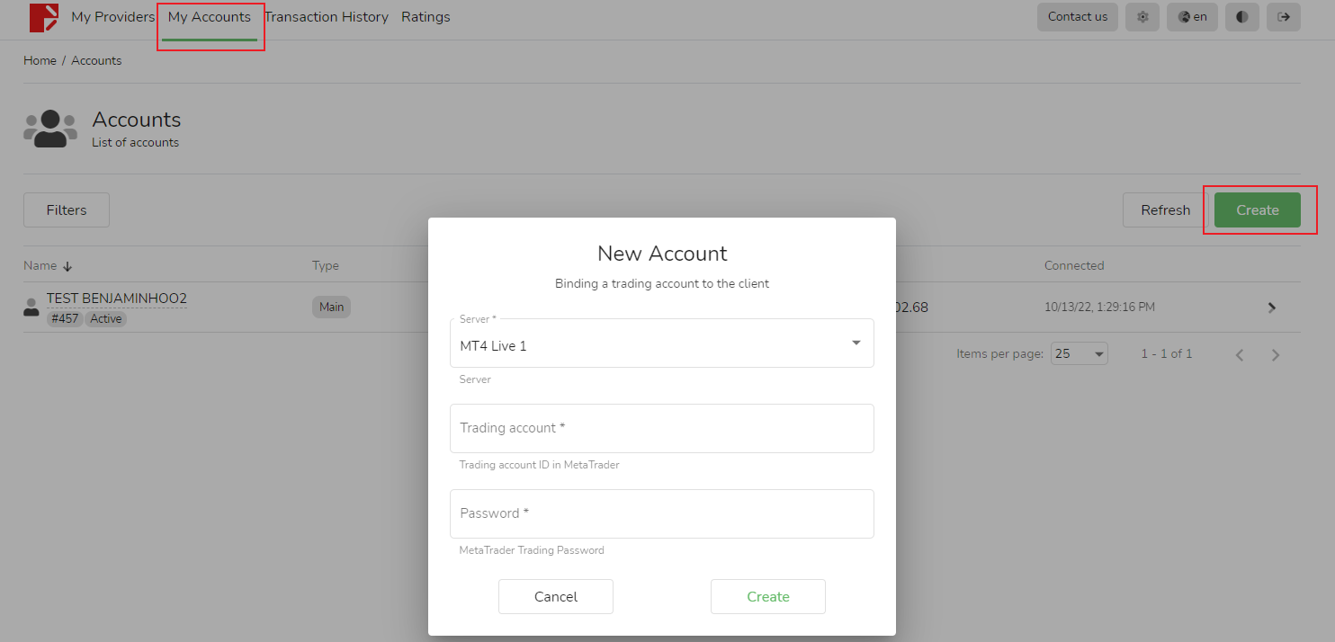 En la página [Mi cuenta] del seguidor, puede agregar una nueva cuenta comercial haciendo clic en el botón verde [Crear]. Sin embargo, esta cuenta no se puede utilizar para iniciar sesión y solo se puede seleccionar como fuente de señal, seguidor o configurada para recibir tarifas de rendimiento.