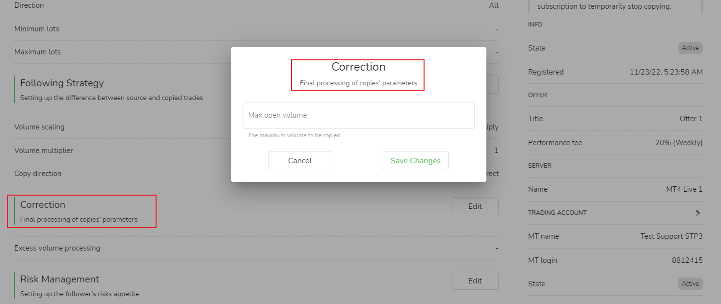 - 수정은 결국 실행될 최대 복사 거래량을 설정합니다. CopyTrading의 추종자는 신호 소스의 거래 포지션의 위험을 제어할 수 있을 뿐만 아니라 그들이 배치해야 하는 위치의 크기에 대한 위험도 제어할 수 있습니다.