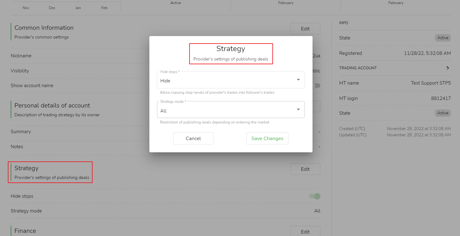 실적 수수료 수락 계정:시그널 소스가 팔로워를 모아 시그널 소스에 성과 수수료를 지불하는 거래 계정은 기존 계정을 선택하거나 새 계정을 추가할 수 있습니다.새 계정을 추가하는 과정에서 거래 계정(즉, MetaTrader의 거래 계정) 및 암호(즉, MetaTrader 거래 암호)를 입력한 다음 [변경 사항 저장]을 클릭하면 성공적으로 설정이 완료됩니다.