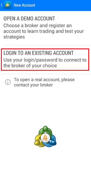 MetaTrader 4 모바일 버전을 설치한 후, 소프트웨어를 클릭하여 로그인 페이지로 들어갑니다.이미 실제 계정을 개설했다면 "기존 계정으로 로그인"을 선택하십시오.
