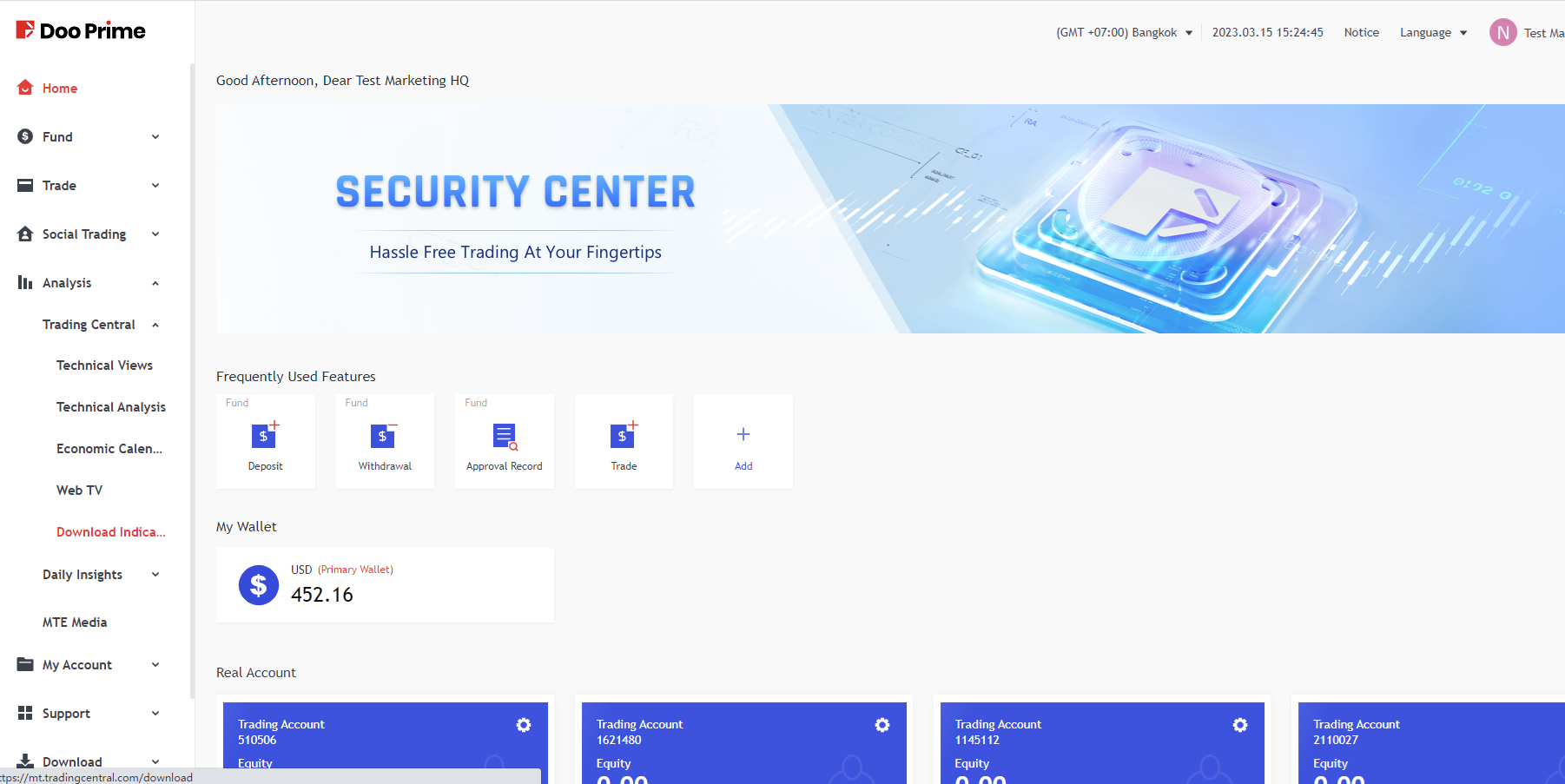 1. 먼저 Doo Prime 사용자 센터에 로그인한 다음 왼쪽 메뉴 표시줄에서 "Analysis"를 클릭하고 "Download Indicators"를 선택합니다. 이 시점에서 하단 메뉴 표시줄을 확인하십시오. Trading Central 지표가 다운로드되었습니다.