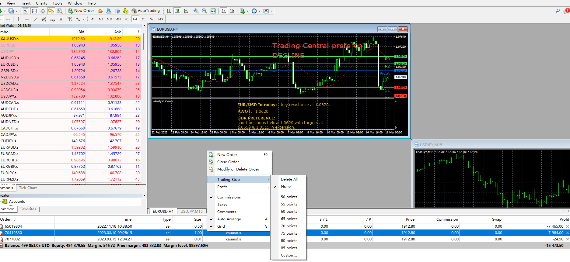 Clique em "Negociar" na barra do terminal para visualizar as ordens existentes, clique com o botão direito do mouse para selecionar a ordem de espera, clique em "Trailing Stop" e selecione "Personalizado" e preencha o número de pontos de parada móvel que você precisa definir.
