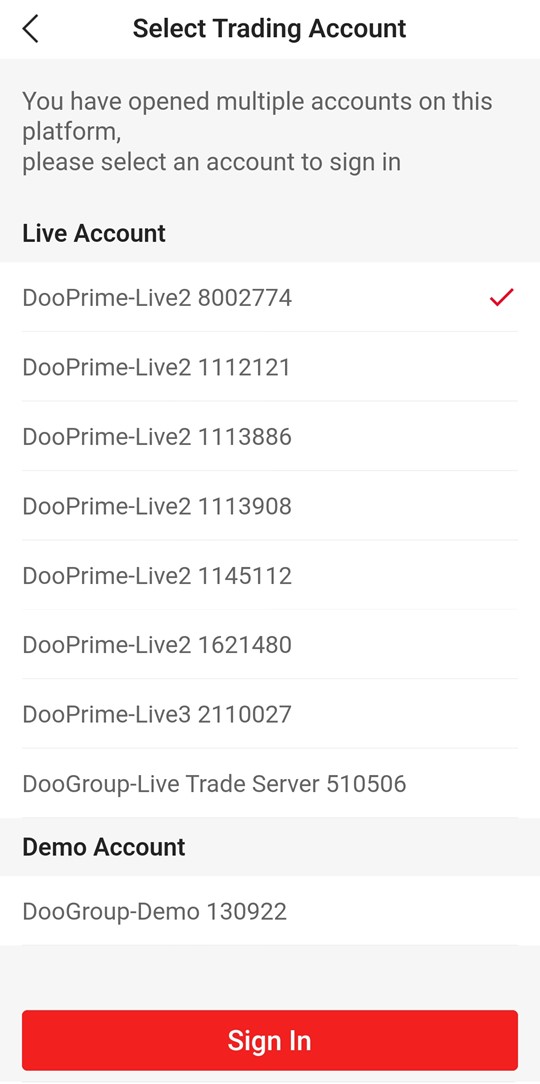 Depois disso, selecione a conta real ou demo que você abriu de acordo com suas necessidades pessoais e clique em "Avançar" para começar a negociar com a D Prime InTrade.