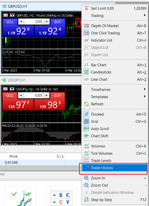 Se você não precisa desta função, você pode fechá-la da seguinte maneira: passe o mouse sobre o espaço em branco do gráfico, clique com o botão direito do mouse e remova o [Histórico de negociação] marcado: