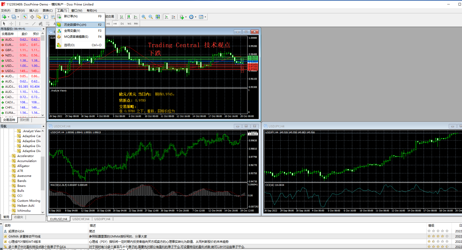 1. 请您登录 MT4 后在顶部菜单栏点击「历史数据中心」。