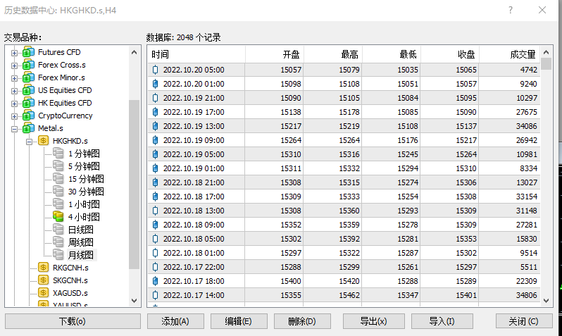 2. 在左侧菜单栏中选择具体交易品种后便可查看历史数据。