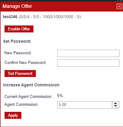 d. 若要變更“代理程式佣金”或/和“密碼”,請在“報價與追蹤者”表中按一下“管理”。選擇「停用」或「啟用報價」以變更報價的狀態。