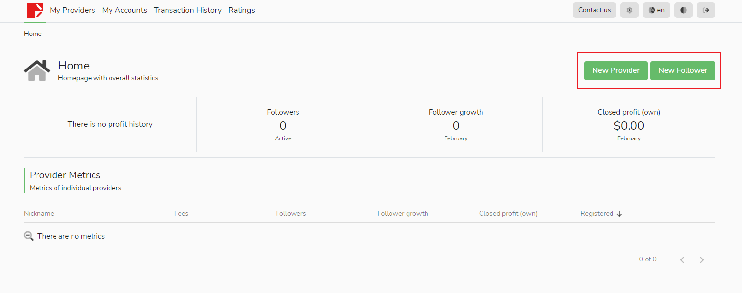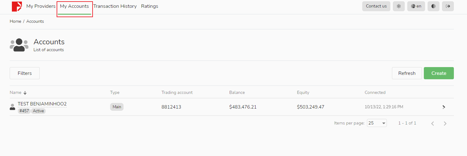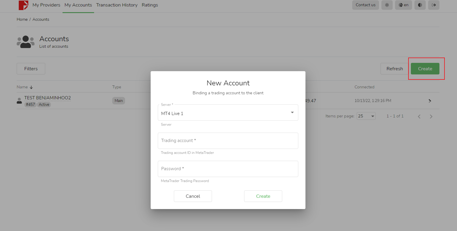 Trên trang [Tài khoản của tôi] của nguồn tín hiệu, bạn có thể thêm tài khoản giao dịch mới bằng cách nhấp vào nút [Tạo] màu lục. Tuy nhiên, tài khoản này không thể được sử dụng để đăng nhập và chỉ có thể được chọn làm nguồn tín hiệu, người theo dõi hoặc thiết lập để nhận phí hiệu suất.