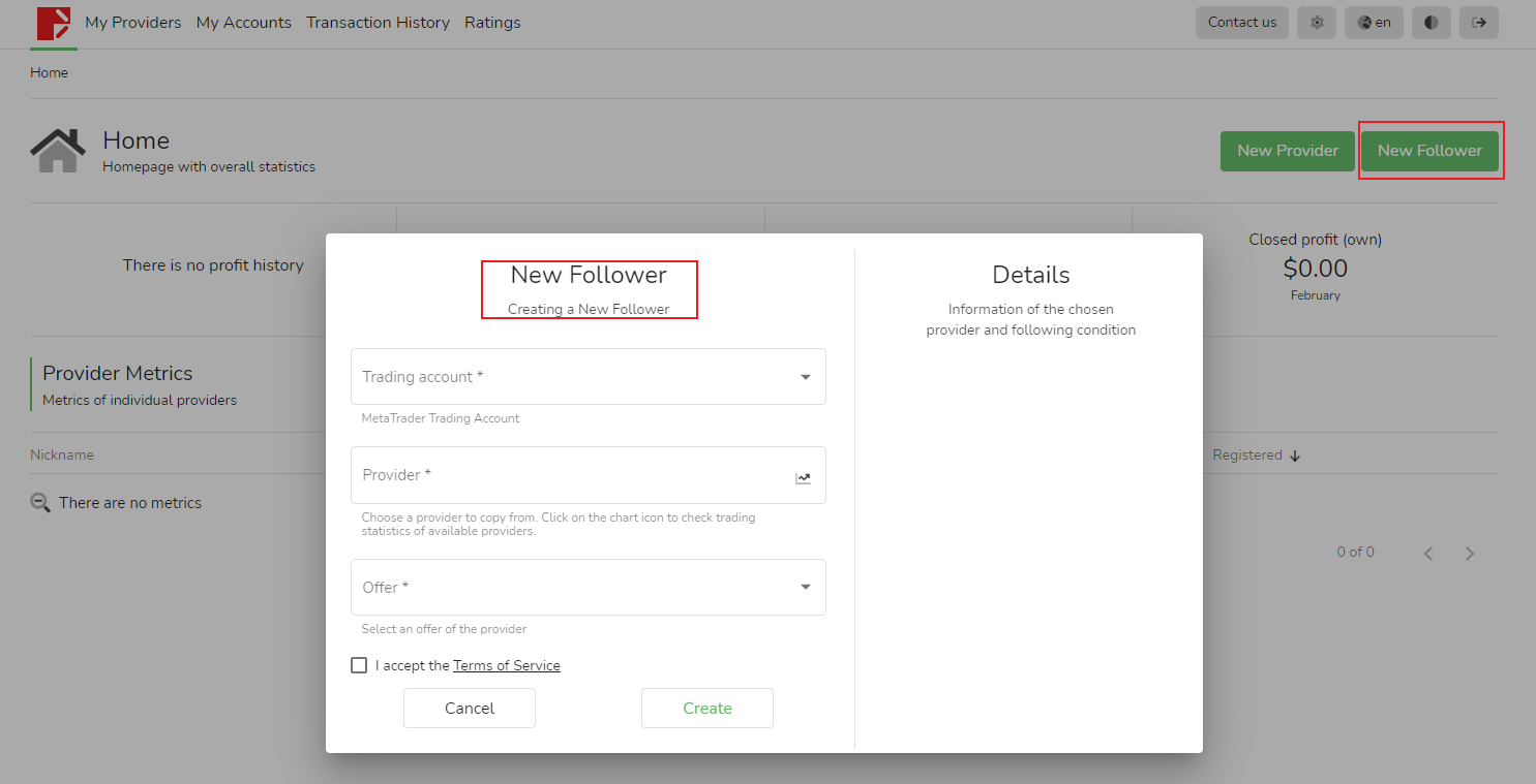 Sau khi đăng ký thành công người theo dõi, hãy nhấp vào [Thêm người theo dõi] ở trên cùng bên phải của trang chính, sau đó lần lượt điền vào [Tài khoản giao dịch], [Nguồn tín hiệu] và [Điều kiện sao chép] và chọn [Tôi chấp nhận điều khoản dịch vụ] .