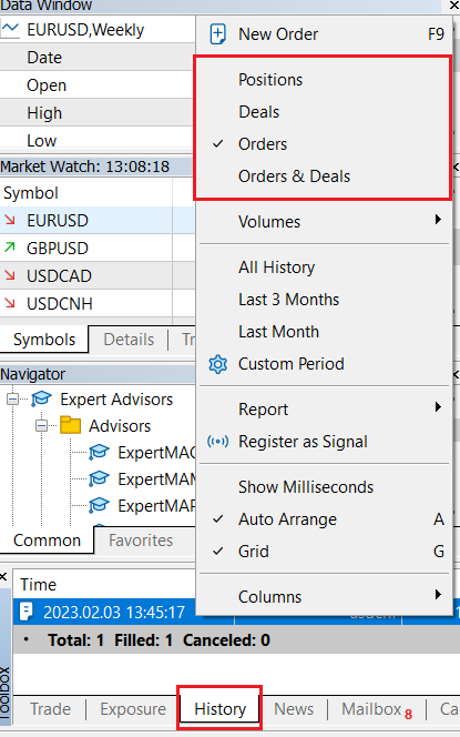 Các lệnh lịch sử MT5 sẽ nhất quán với việc hiển thị các lệnh lịch sử MT4 và việc mở và đóng một lệnh sẽ cộng lại thành một số lệnh;