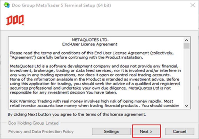 Sau khi quá trình tải xuống phiên bản MT5 Windows dành cho máy tính để bàn hoàn tất, hãy nhấp vào [Tiếp theo] trong hình theo hướng dẫn cài đặt để bắt đầu cài đặt.